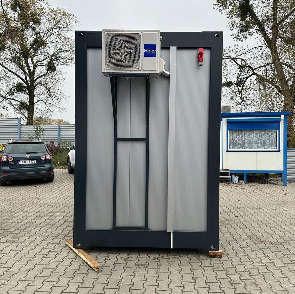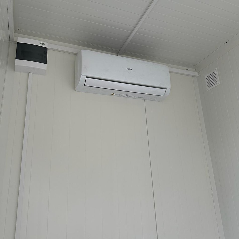 INSTALACJA ELEKTRYCZNA: gniazdo/puszka zewnętrzna podłączeniowa – 1 szt., oświetlenie LED – 1 szt., skrzynka z bezpieczniakimi – 1 szt., zabezpieczenie RP – 1 szt., gniazdka wenętrzne 2x230V – 2 szt., włącznik – 1 szt., klimatyzator grzewczo-chłodzący Haier 3,5 kW – 1 szt. (3,6 kW)